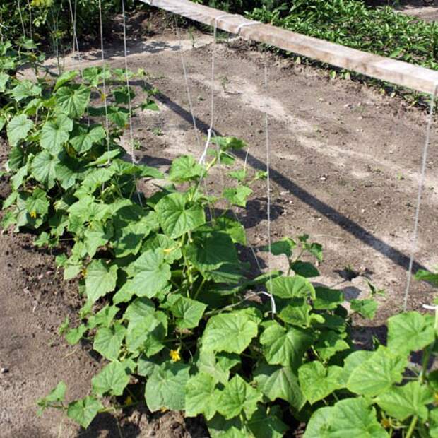 Когда растения достигнут 30 см в длину, их необходимо поднимать и подвязывать к горизонтальным опорам. С помощью растущих на кустах усиков, огурец самостоятельно закрепится на веревке и продолжит рост.