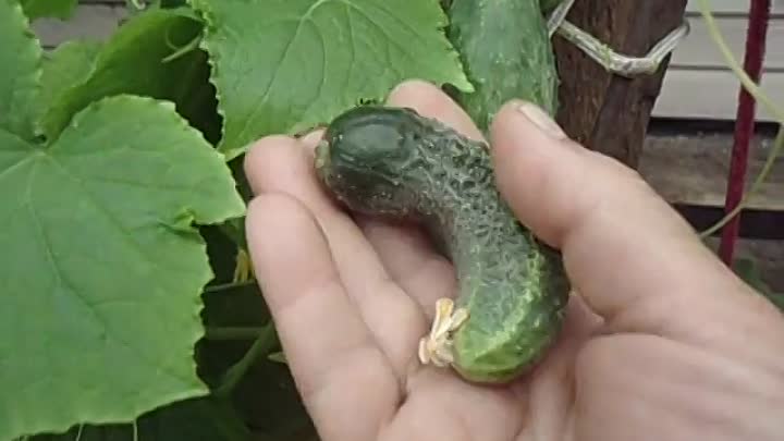 2. Скрючиться плоды могут из-за недостатка опыления. При этом окрас у них будет неравномерным: темно-зеленый у плодоножки и светлый на кончике. Если вы посадили пчелоопыляемые сорта в теплицу, обязательно помогайте растениям опылиться.