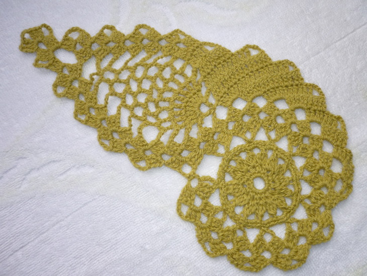 Затем 5 воздушных петель, 1 столбик сбн в столбик с накидом, 5 воздушных петель, столбик сбн в столбик с накидом лепестка. Продолжайте соединять лепестки цепочками: * 4 воздушные петли, столбик без накида в ст.с2н лепестка * — повторить 5 раз. Затем 6 воздушных петель, лицевая гладь в 5-й из 6 воздушных петель, 6 воздушных петель, соединить вершину огурца лицевой гладью. Далее вяжем по контуру столбиками без накида, кроме петли, которая образовалась в вершине из 5 воздушных петель.
