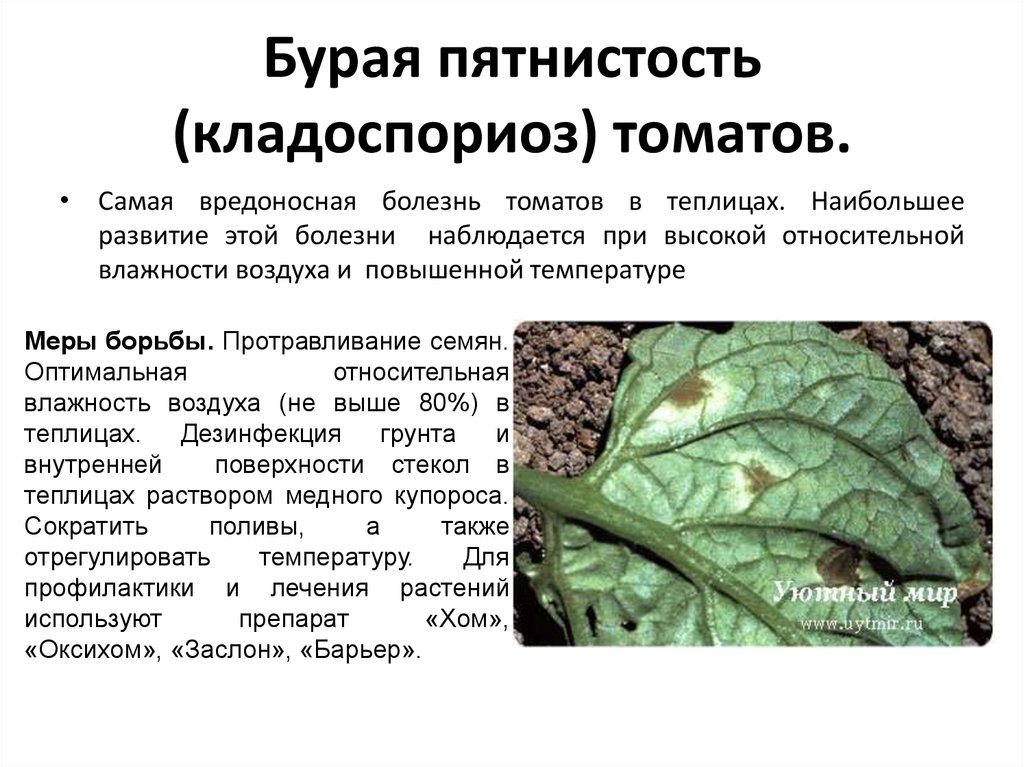 Меры борьбы: В первую очередь, для предупреждения прихода паутинного клеща в теплицу, необходимо своевременно проводить проветривания растений в теплице, и не допускать снижения нормальной влажности воздуха (в солнечные дни 85-90%, а в пасмурные 75-85%).