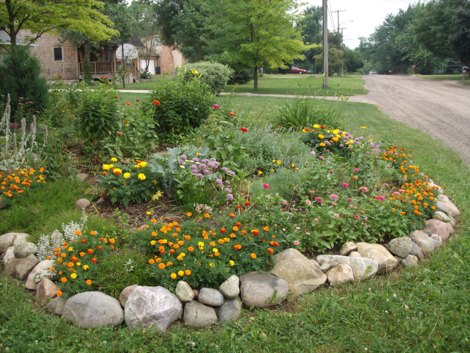 Поскольку яркие цветы выделяются на фоне зеленого газона, то делать окантовку вокруг клумбы не обязательно. У клумбы есть своя естественная граница. Единственная, пожалуй, проблема будет связана с уходом за газоном на границе с клумбой.