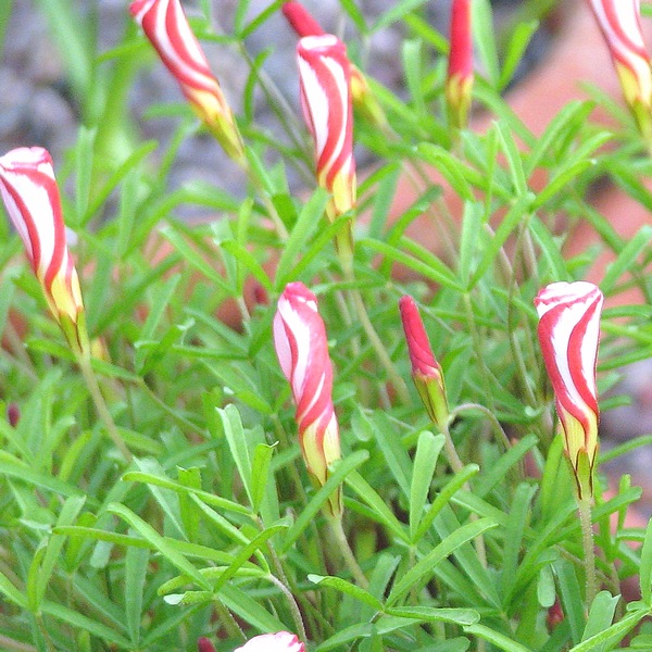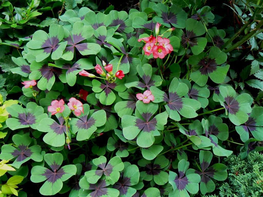 | Цветок этого оксалиса очень яркий и красивый, по форме напоминает колокольчик. Он окрашен в розово-красный цвет и напоминает клевер. | Кислица фиолетовая пестроцветная | Отлично прорастает в саду и в домашних условиях. |