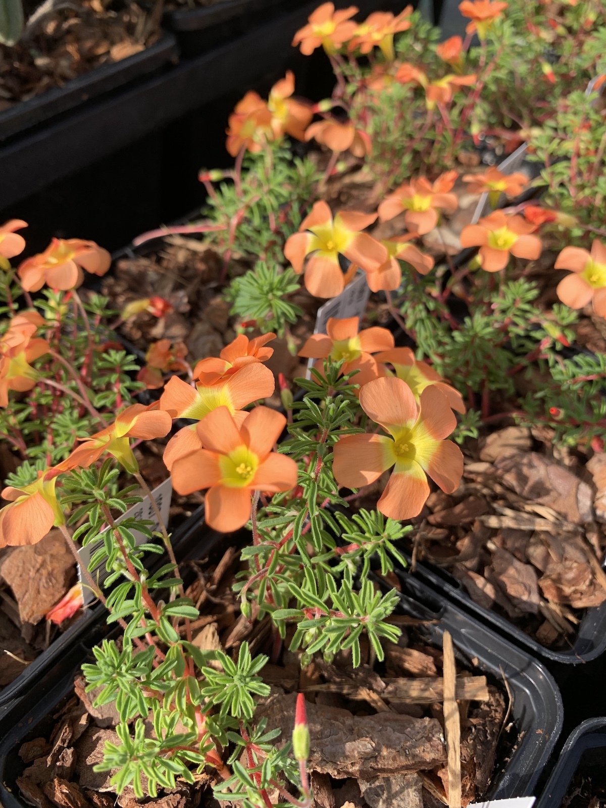 Для формирования красивых переливов цветов оксалис подходит идеально: окрас в сочетании с прочими растениями формирует цветочные узоры на клумбах.