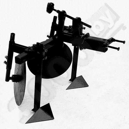 - Выполните общую сборку. Покрасьте металлические поверхности. Вставьте поперечину во втулку рукоятки, зафиксируйте стопорными болтами. Закрепите ступицы дисков на стойках. Вкрутите поперечины так, чтобы они вошли в отверстия втулки. Наденьте тяги с дисками на поперечную балку. Винт.
