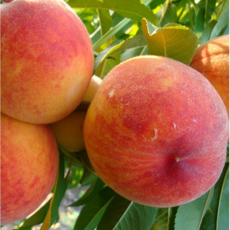 Плоды персика обладают овальной или же круглой формой, а также они имеют характерную борозду на одной из сторон. Цвет и структура кожицы зависит от сорта фрукта. К примеру, она может быть бархатистой, с небольшими, но густыми ворсинками, а также полностью гладкой. Окрас персика может быть желтым, красным или же желто-красным (см. фото). Сочная и сладкая мякоть, в основном, окрашена в желтоватый цвет, хотя встречаются экземпляры с белой или желто-красной мякотью.