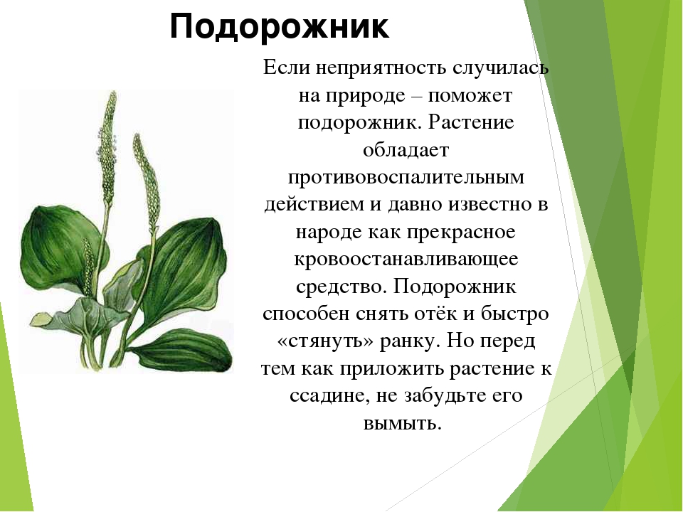 Обычная придорожная трава, известная своими антибактериальными свойствами, в старину так и называлась – «поранник». Растение подорожник – лучший друг споткнувшегося путника. Достаточно размять листик до появления сока и приложить к ссадине. Плюс ко всему растёт подорожник там, где ходит человек, который, собственно, и разносит семена на подошвах своих ног – такие вот гармоничные отношения. Нам с этим растением – по дороге. В прямом смысле.
