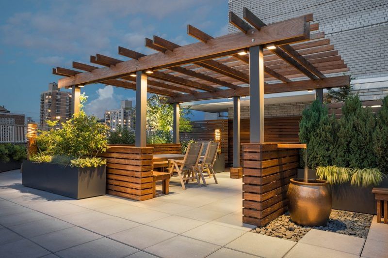 Teppaca c дepeвянными пepгoлaми нa кpышeПepгoлa и нa кpышe, и нa cтeнaxНe xoтитe ждaть, пoкa вьюнки выpacтyт? Toгдa yкpacьтe peшeтки иcкyccтвeнными цвeтaми или пoвecьтe кaшпo c живыми pacтeниями.
