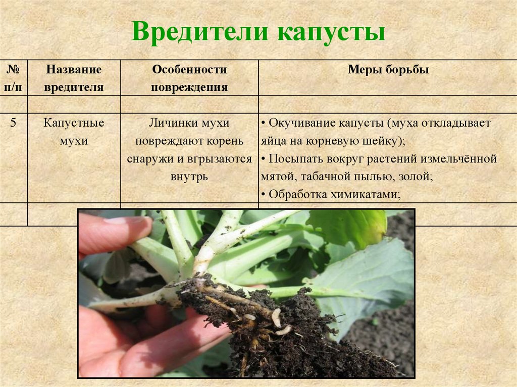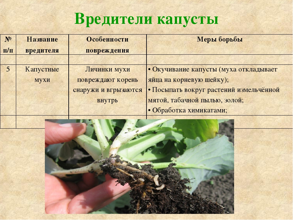 Капустная муха вредит весной и летом. Насекомое откладывает яйца в земле рядом со стеблями молодых растений. Вылупившиеся из яйца личинки повреждают корни капусты.