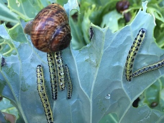 Импортный капустный червь (личиночная форма бабочки капустной белой с белыми крыльями с одним или двумя черными пятнами на крыло) бархатно-зеленого цвета с узкой светло-желтой полосой посередине спины.