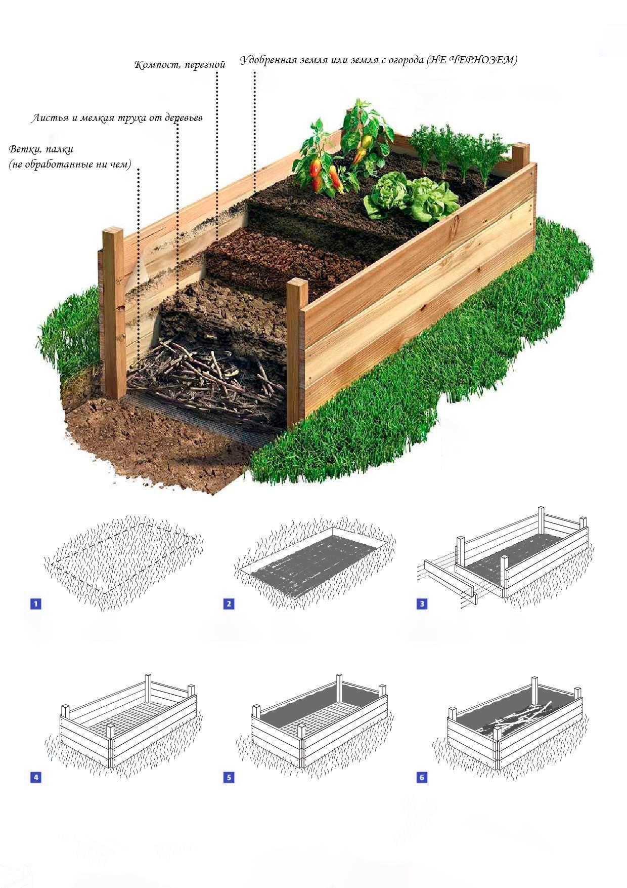 Первым слоем засыпьте долго разлагающийся органический материал: обрезки досок, стружку, ткань (не синтетику! ), ветки, бумагу, картон и так далее. Заполните этими «полезностями» грядку примерно на 1/3, чуток присыпьте землёй и хорошо пролейте водой. Далее заполните грядку до верха почвой, перемешанной с навозом, компостом, минеральными удобрениями и снова пролейте водой. Вот и вся премудрость. Только учитывайте, что на следующий год земля осядет на 15-20 см и нужно будет обновить верхний слой, поэтому подготовьте плодородную землю заранее.