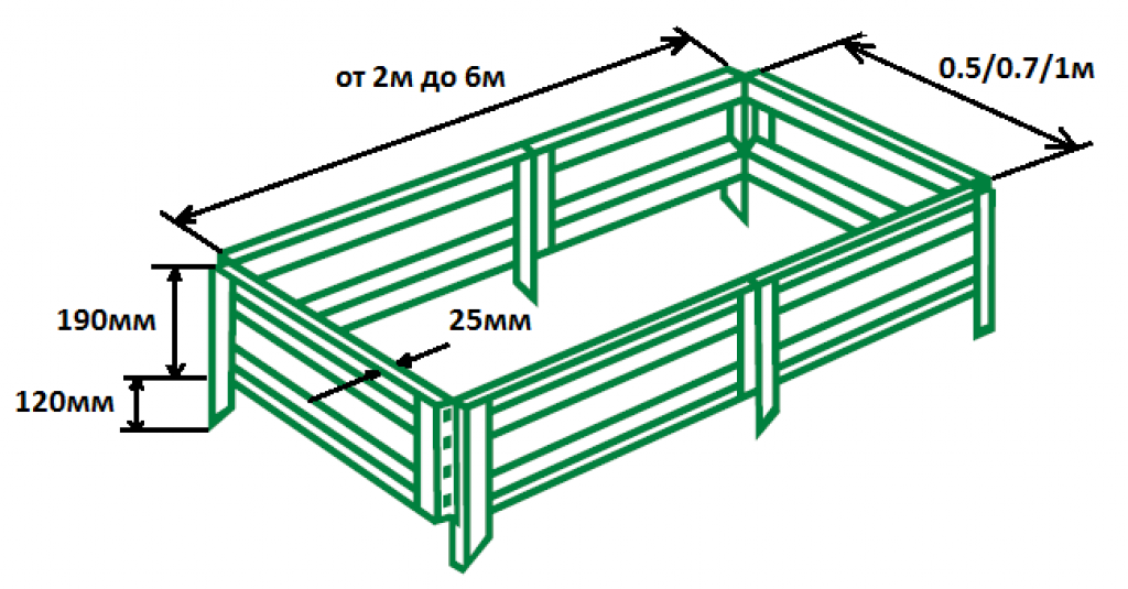 Размеры могут быть какими угодно, но (!) вы должны легко дотягивались до середины. А если вы соорудили грядку вплотную к стене или забору, то расстояние прикиньте, исходя из того, достанете ли вы руками до противоположной стороны (обычно ширина пристенной грядки не превышает 80 см). Стандартный размер отдельно стоящей грядки: 1 м в ширину, от 1,5 м в длину и 30-50 см в глубину.Повторюсь: можете варьировать размеры по собственному желанию – лишь бы вам было удобно. Расстояние между грядками обычно делают 40-50 см. Этого вполне достаточно, чтобы удобно расположиться, ухаживая за огородными культурами или собирая урожай.