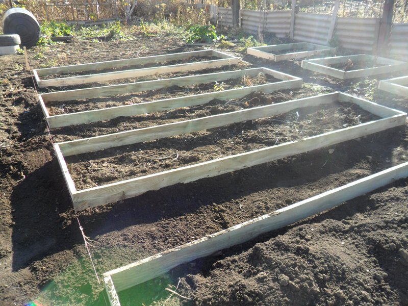 На низинных сырых участках грядки лучше соорудить осенью, сделать их небольшого размера (можно 1х1 м), высотой не более 30 см. Тогда почва станет лучше прогреваться, снег весною сойдёт быстрее, а вы сможете посеять огородные культуры на пару недель раньше обычного срока. Сбейте квадратом 4 доски (1х1 м), установите конструкцию на горизонтальную поверхность, засыпьте землёй вперемешку с , и – грядка готова. Для пущего эффекта можете .