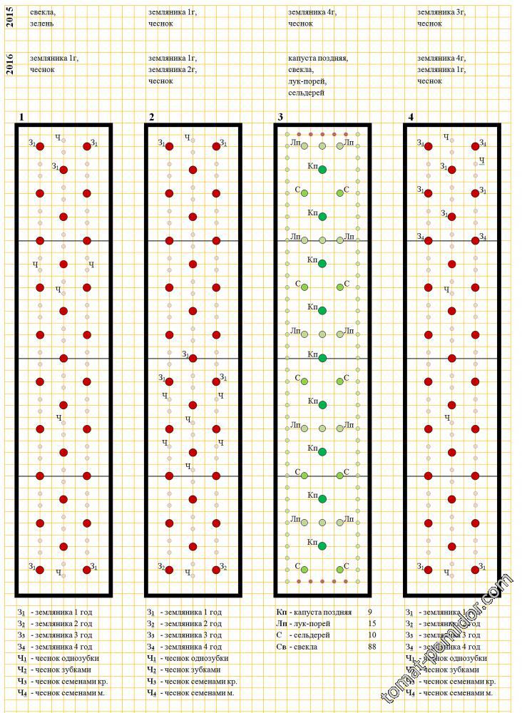 На второй год их сменяют лук, перец, помидоры, картофель. На третий наступает очередь корнеплодов (моркови, свеклы, редьки и пр.), которым приходится добавлять изрядную порцию минеральных удобрений.