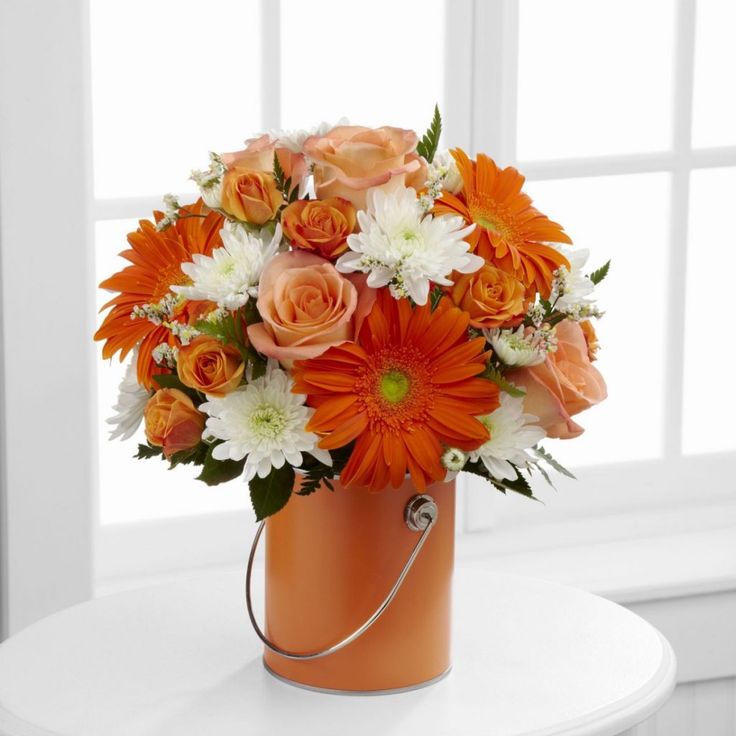 После зимних месяцев солнце и распустившиеся цветы — это долгожданное зрелище! Отпразднуйте солнечные дни с композицией из оранжевых цветов.