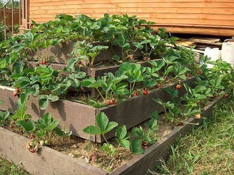 Один из самых известных способов. Позволяет сделать многоярусную грядку для клубники как из древесины, так и из автомобильных покрышек. Принцип сбора конструкции одинаков.