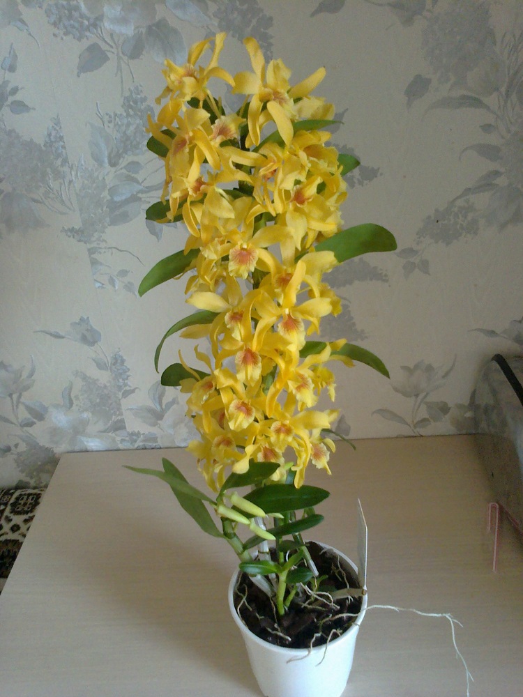 Как можно судить по фото, орхидея дендробиум Линдли имеет необычный вид. Длинные цветоносы, которые будто стекают из горшка, — вот за что многим людям полюбился сорт! Цветы золотисто-желтые, многочисленные, имеют приятный аромат.