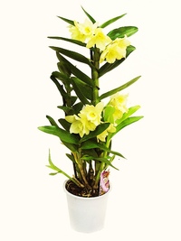 По фото орхидеи дендробиум густоцветной видно, насколько прекрасно растение! Высота — не более 45 см, стебли четырехгранные, сильные, мясистые. Листва располагается на самом верху. На макушках же появляются и повисающие цветоносы, густые. В одном кистевидном соцветии может быть до ста цветов, источающих приятный аромат. Окрас лепестков желтый, опущенная губа с оранжевым оттенком. Диаметр одного цветка до 5 см, но они берут своим количеством (по фото цветов дендробиума видно, что цветение густое).