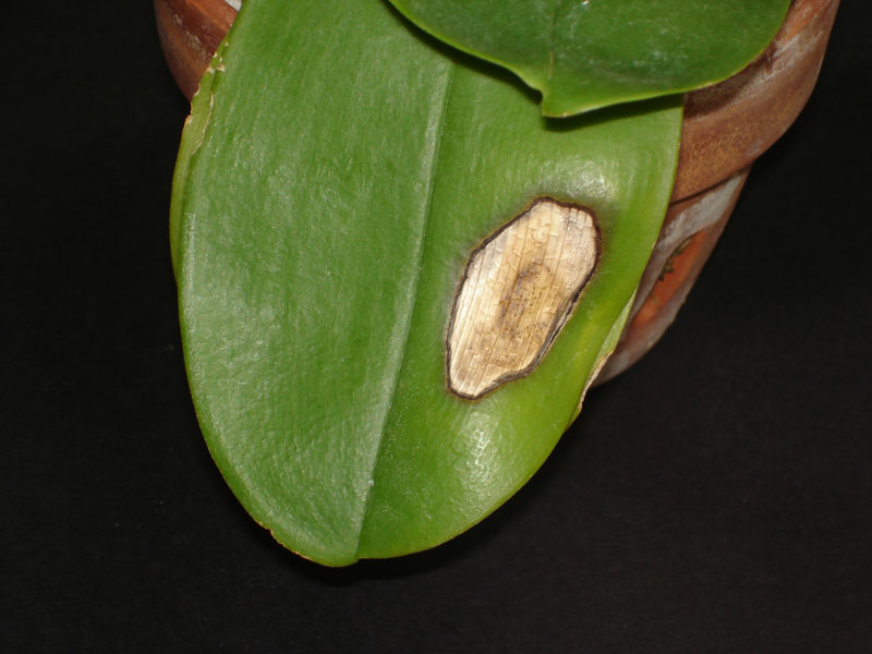 На листике орхидеи появилось коричневое пятно, внешне похожее на ожог. Обнаружив такое пятно, убедитесь, что на цветок не падают солнечные лучи и не обжигают его листья. Заметив это, примите меры к избавлению растения от вредоносных солнечных ванн.