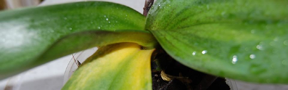 - Растение слишком обильно поливается, грунт, в который посажено растение, постоянно влажный. От этого желтеют и отпадают листья, гниют корни и стебли орхидеи. Фаленопсису требуется умеренный полив, он не переносит мокрой почвы. Перед каждой следующей порцией влаги почва в горшке должна стать почти сухой.