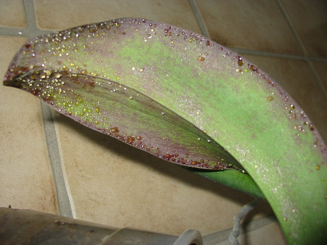 - Ещё одним следствием обильного полива может стать образование на всех частях цветка водянистых пятнышек коричневого цвета, с течением времени увеличивающихся в размерах и сливающихся в одно более крупное. В тёплую погоду при высокой влажности в центре таких пятен может появиться розовый студень. Так выглядят споры, и это явные признаки Антракноза, одного из заболеваний, присущих орхидеям. Тут нужно хирургическое вмешательство. Требуется аккуратно срезать с больных органов орхидеи воспалившиеся участки и смазать получившиеся ранки углём, растолченным в порошок. Можно также смазать срезы раствором йода. Для более эффективной обработки можно применить биопрепарат Микосан, а также медный фунгицид.