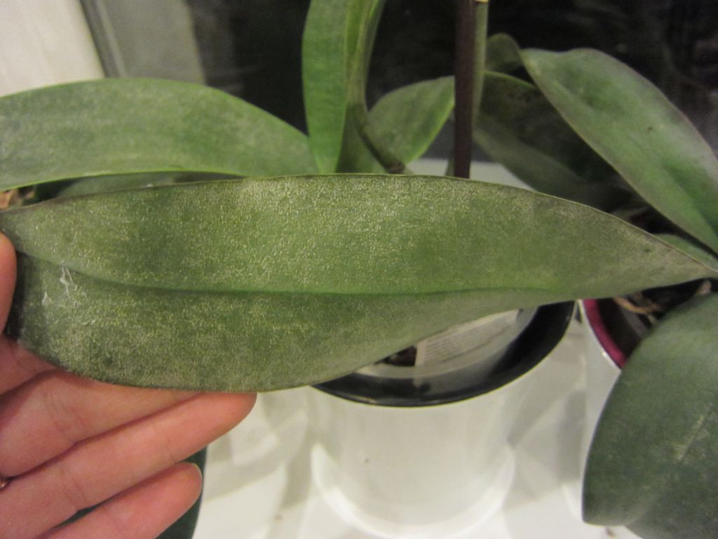 Вместе с цветками страдают и листья орхидеи. Они покрываются пятнами серого цвета, внутри которых наблюдается легко стираемый пепельный налет.