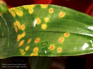 Первые симптомы этих болезней орхидей проявляются небольшими черными или фиолетовыми пятнами, которые впоследствии удлиняются и придают листьям растения очень неприятный вид.