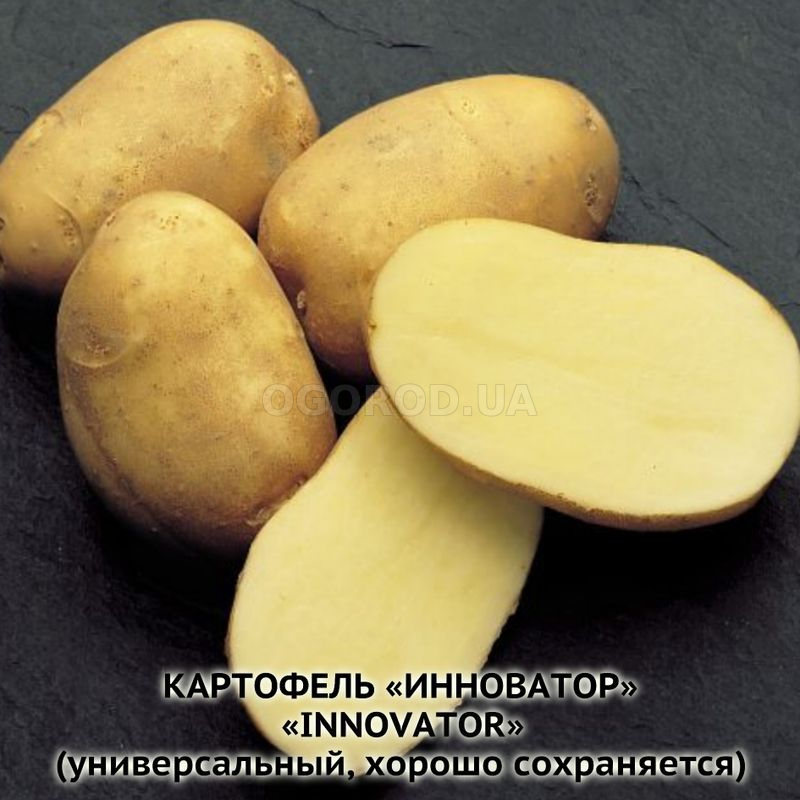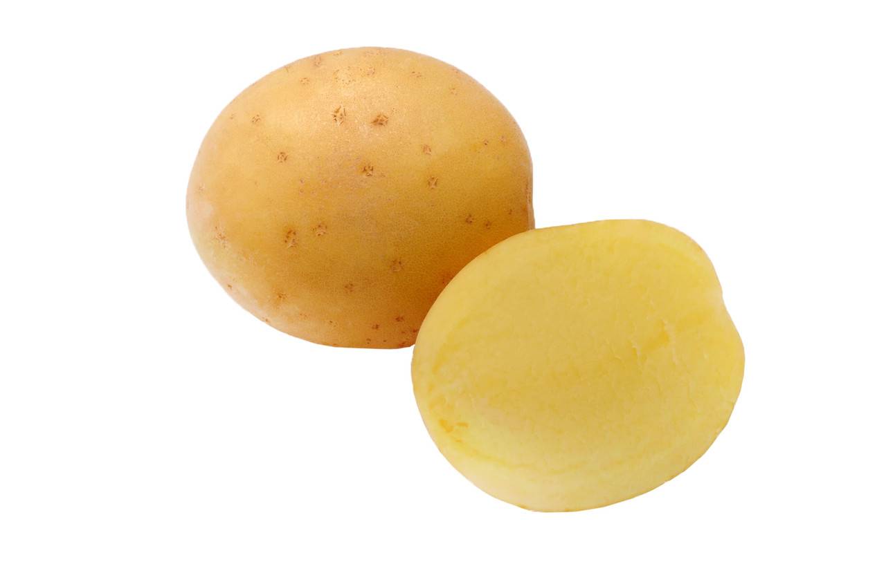 Мякоть и кожура желтые. Глазки мелкие поверхностные. Крахмалистость невысокая, 13-14%. Лежкость — 95%.