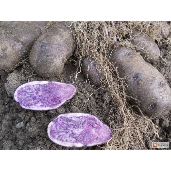 Кусты полупрямостоячие или прямостоячие, средней высоты. Стебли покрыты мелкими листьями ярко-зеленого цвета с волнистыми краями. Соцветия некрупные фиолетово-розовые, внутри окраска более насыщенная. Клубни овальные, средний вес — 88–115 г. На кусте формируется по 10–12 овощей. Товарная урожайность — 214–375 ц/га.