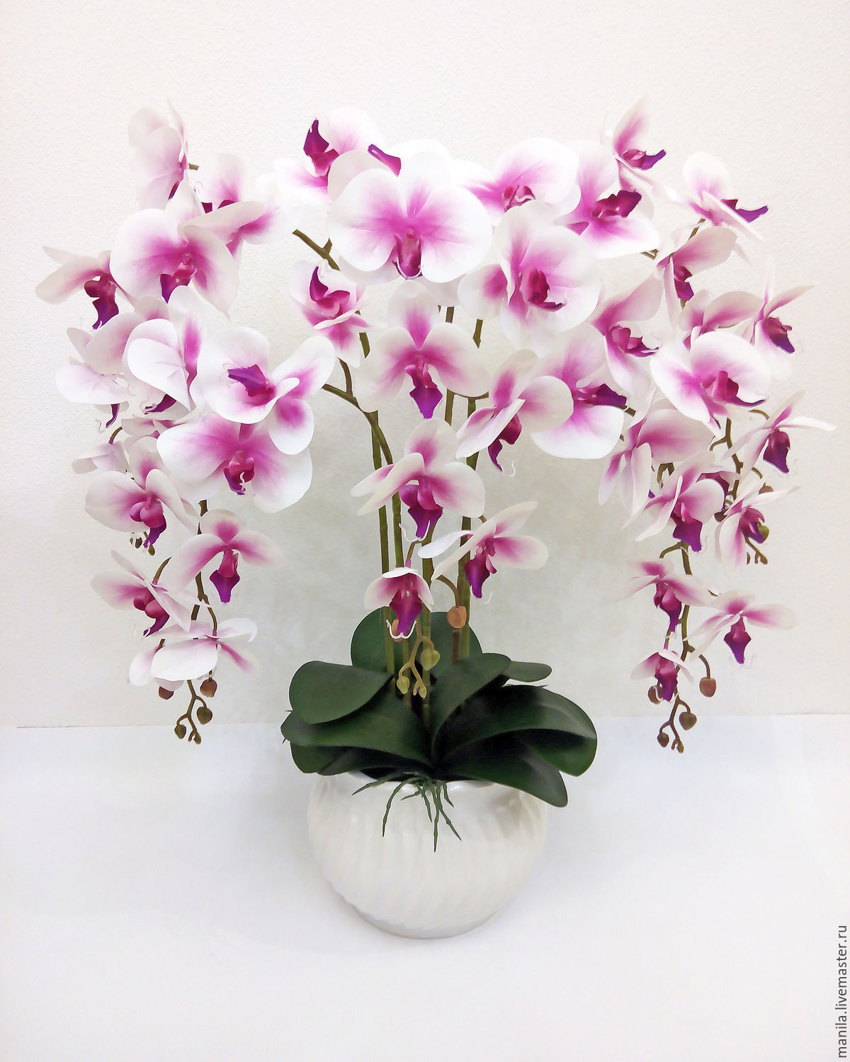 Фаленопсис Стюарта. Листья у него пестрые, а корни — серебристые. Цветонос — длинный и ветвистый (до 80 см), зато и цветов на нем бывает очень много — порой до 60 штук одновременно. Нежные белые цветы с красными пятнышками у основания, в центре цветка — губа янтарного цвета, плавно переходящего в пурпурный.