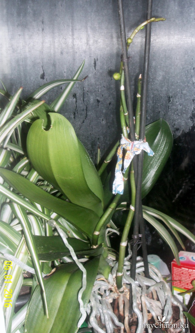 Приблизительно через четыре, пять месяцев возможно появление новых цветочных стрелок на старом цветоносе. Такое разветвление зависит от условий содержания цветка. Если же старая стрелка отцветет и высохнет, то новая будет появляться чуть дольше. При подсыхании, цветонос необходимо отрезать по еще живой зеленой части стрелки, а срез продезинфицировать активированным углем, измельченным в порошок. Можно замазать срез йодом, зеленкой или присыпать корицей.