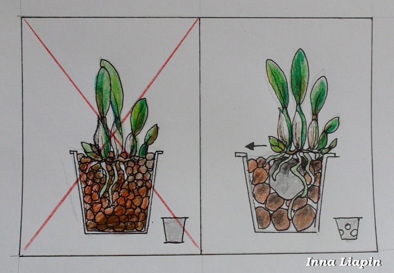 Если в помещении недостаточная влажность лучше под корни подложить сфагнум, который не даст корням быстро высыхать. В помещениях с сухим воздухом корни дополнительно можно прикрыть корой, корнями папоротника, кокосовым волокном. Такое решение создаст условия посадки в горшок с субстратом.
