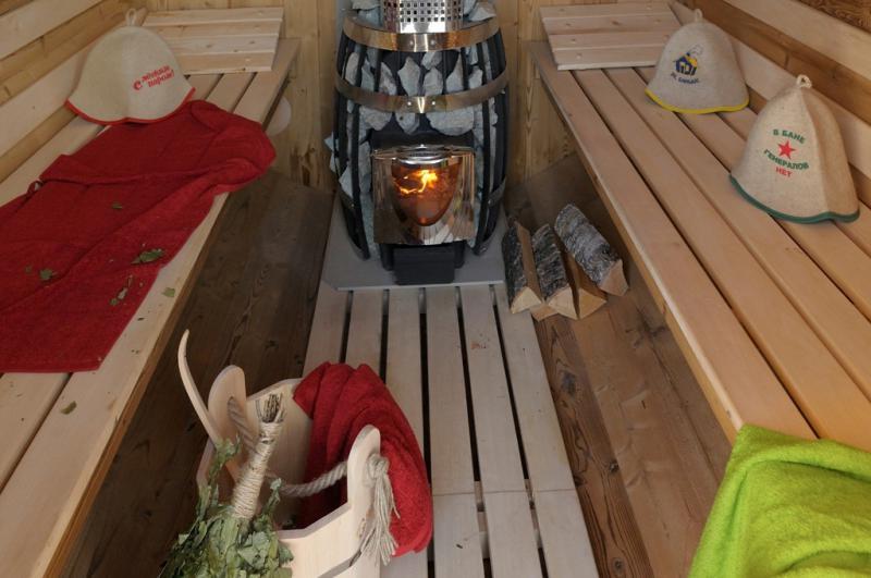 В большей из них размещены сидения и туда подается нагреваемый наполнитель для принятия процедур, а в меньшую встраивается печь (электрическая или дровяная), которая будет разогревать воду до температуры в 45-50 градусов по Цельсию.