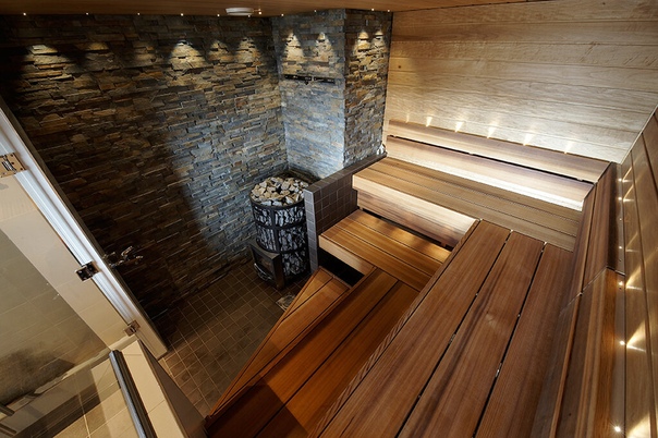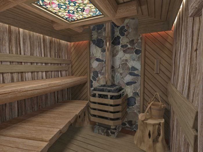 Зачастую в бане используется и комбинированная отделка: дерево с камнем. В первую очередь это касается зоны где установлена печь.