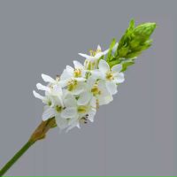 Цветонос может достигать 80 см в высоту. Белые цветы диаметром около 5 см собраны рыхлым малоцветковым соцветием на безлистном цветоносе.