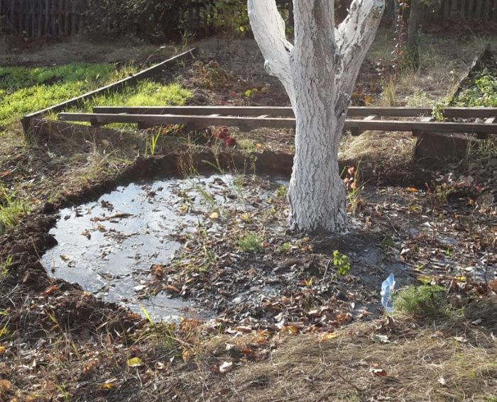 Существует несколько способов полива, выберите метод, подходящий вам. Если участок ровный, подзимний полив проще всего осуществлять с помощью шланга. Облегчите себе задачу, сняв верхний слой 2 см в приствольных кругах дерева. Продумайте системы борозд и траншей, чтобы они соединялись с соседними грядками. Вода, перетекая, обработает весь сад, пока вы занимаетесь другими делами. Если участок неровный и находится на склоне, используйте метод полива дождеванием. С помощью него вода равномерно распределится по участку, захватив удаленные уголки. Минус дождевания в повышенной влажности воздуха, подходящая среда для развития болезней. Популярным методом является капельный полив. Если на участке не установлена система капельного полива, сделайте быстрый ее вариант своими руками, как показано на фотографии.