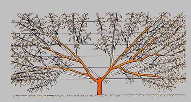 - Обрезка. После посадки персика осенью осуществляется обрезка. Необходимо формировать дерево в виде чаши (такой тип кроны характеризуется маленьким размером штамба, при нем скелетные ветки растут близко к поверхности земли). От места прививки до первого развитого бокового побега необходимо отмерить отрезок в 35 сантиметров. А затем следует обрезать ветви над этим отрезком под кольцо, при это нужно оставить три-пять наиболее развитых побега, они должны быть направлены в разные стороны и между ними должно быть расстояние не меньше 10-15 сантиметров.
