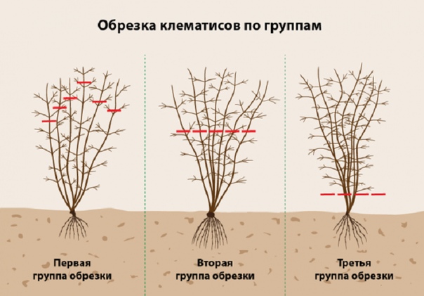 Схема обрезка клематиса в первый год после посадки и в зависимости от его группы обрезки: