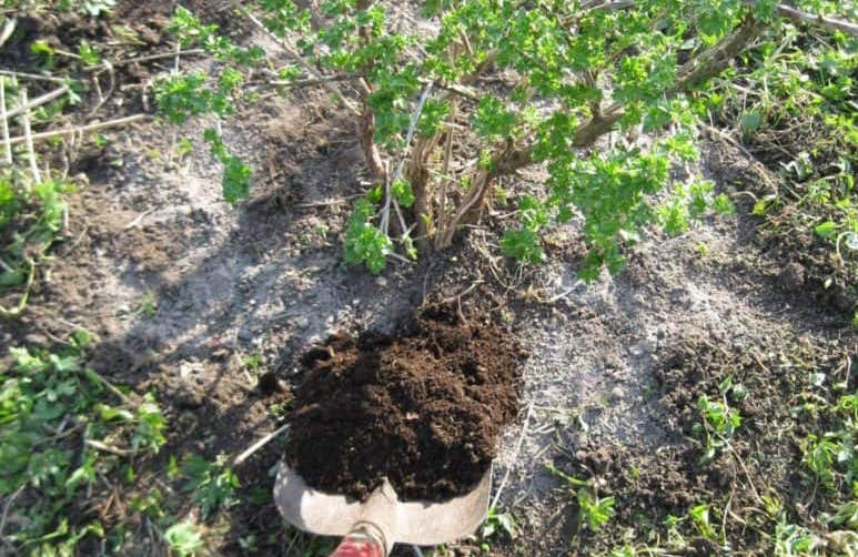 Подкормка укладывается небольшим слоем вокруг ствола кустарника, затем заглубляется на глубину в 5 см.