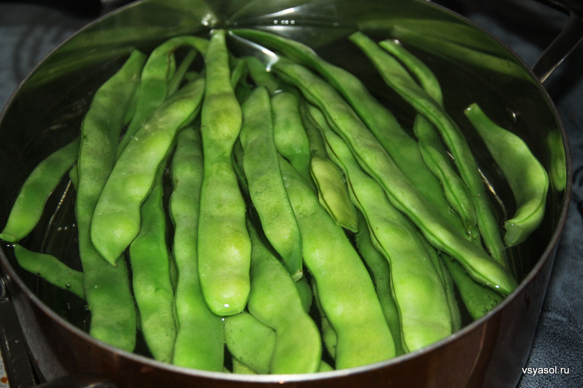 Сделать это надо вовремя, пока створки мясистые и содержат максимальное количество полезных веществ. Сорванные стручки нарезают на куски в 1,5 — 2,0 см. Делают это вместе с недозревшими бобами.