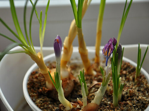 Луковицы крокусов просыпаются рано, поэтому не пропустите начало развития. Перед посадкой неплохо было бы успеть стратифицировать крокусы, поместив в холодные условия, затем снова в тепло.