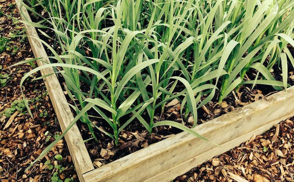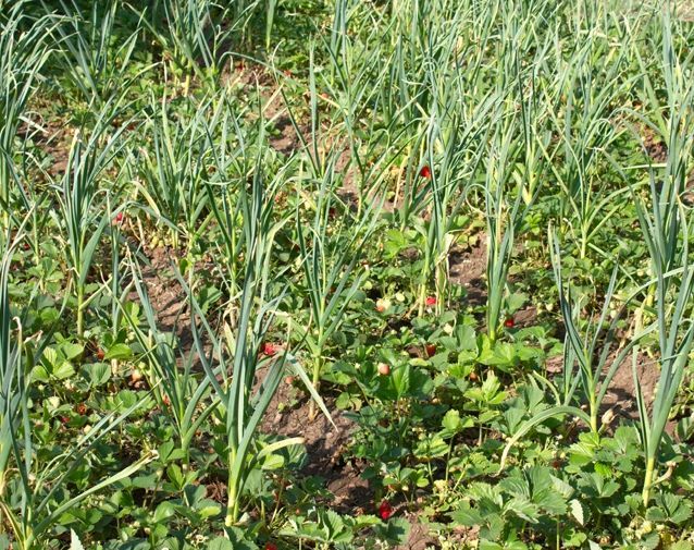 Чеснок растет медленно, и 15-дюймовое пространство между рядами можно использовать для промежуточного посева.
