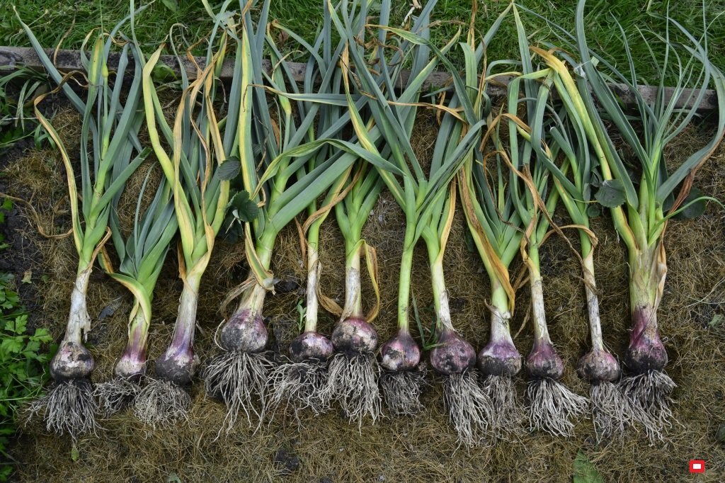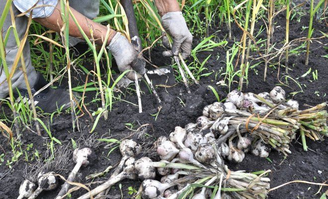 После того как появится пятый лист и чеснок пустит стрелу, необходимо освободить головку от земли примерно до половины. В конце июля стрелки разворачиваются и их необходимо срезать, а головки выкопать и положить под укрытие, чтобы листья полностью усохли. Затем срезаются и сухие остатки – и чеснок готов к употреблению.