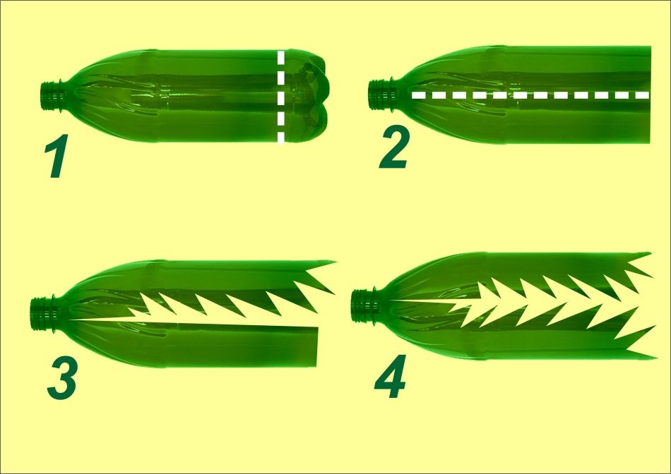 3. Часть бутылки с горлышком разрежьте ножницами на шесть одинаковых частей, доходя до начала сужения верхней части, остановитесь. Каждой разрезанной части нужно придать форму продолговатого треугольника или лепестков. Для этого закруглите и сузьте разрезанные части.