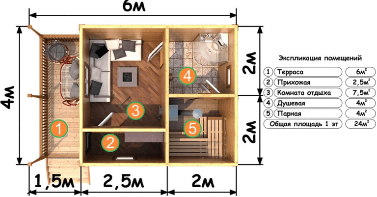 Если моечная и парная в бане – это отдельные помещения, по отношению к раздевалке они должны составлять соотношение 1,5х1х2 м.
