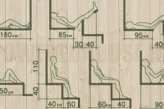 Габариты полок в парилкеШирина обычной сидячей полки должна составлять 40 см. с длиной по размеру помещения. Для того, чтобы сидеть на полке с поднятыми ногами, ее размер должен достигать 90 см в ширину. Длина лежанки варьируется в зависимости от того, в полный рост на ней лежать или с согнутыми ногами: в первом случае можно сделать ее длиной 150 см, во втором – не менее 180 см, учитывая возможность оборудования ее подголовником.