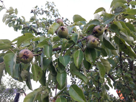 механических средств снижает количество присутствующего инокулята. Грушевая парша зимует в очагах поражения на ветвях и стеблях, а также в любых зараженных мертвых листьях или остатках, опавших с деревьев. Если была парша груши, может потребоваться химический контроль.