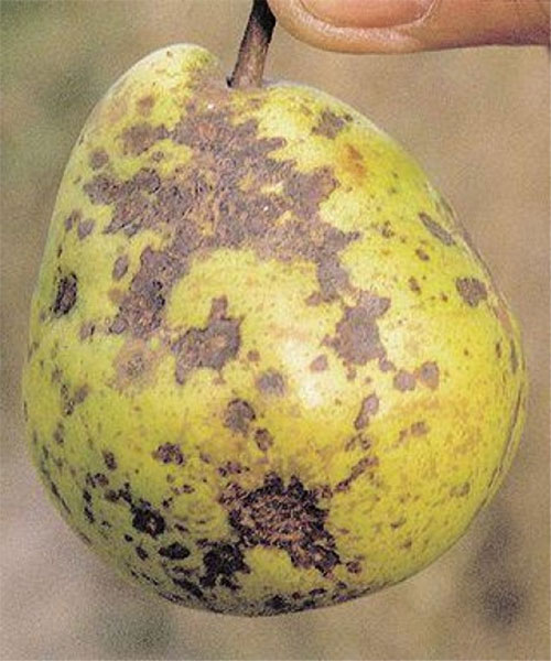 Если развитие болезни произошло уже после завязывания плодов, то парша расселяется на них и поражает. Груши покрываются серо-черными пятнами. При сильном заражении больные места могут слиться воедино. Плоды, заболевшие паршой, не растут, становятся уродливыми и, в конце концов, опадают.