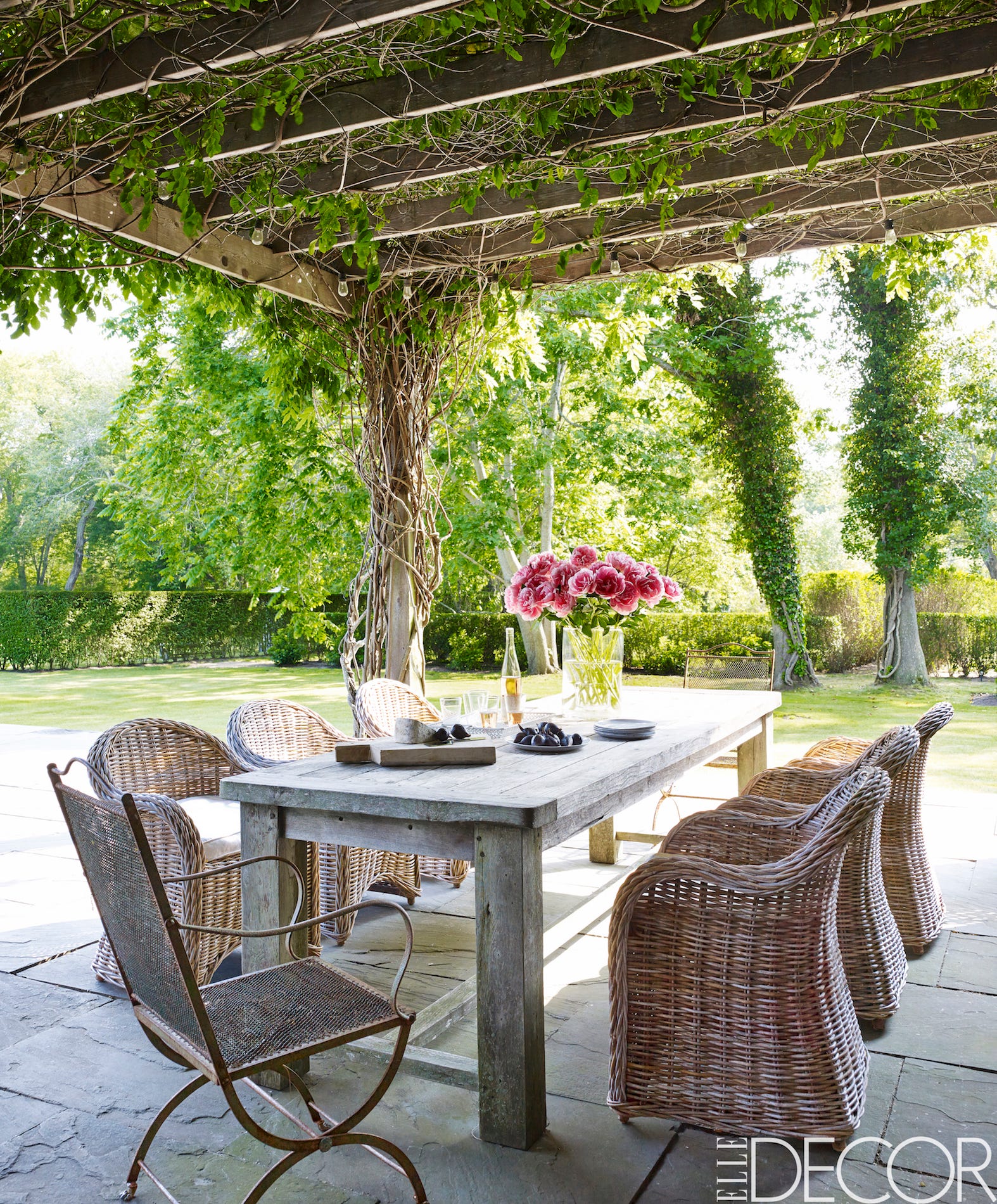 Атмосферу защищенности на открытом патио в саду можно создать с помощью передвижных ширм или стационарных ограждений и решеток, увитых красивыми вьющимися растениями.