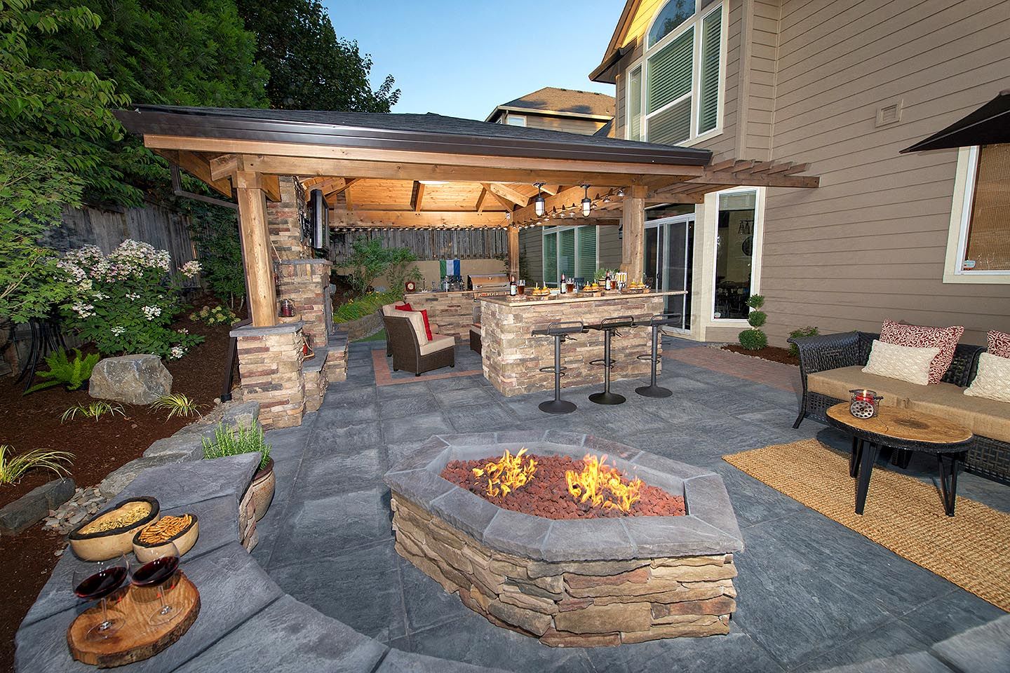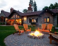 Традиционный внутренний дворик с местом для костра и мощеной стеной для отдыха