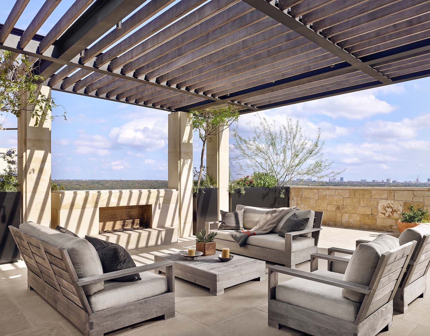 Современное патио с деревянной беседкой и коряги украшения